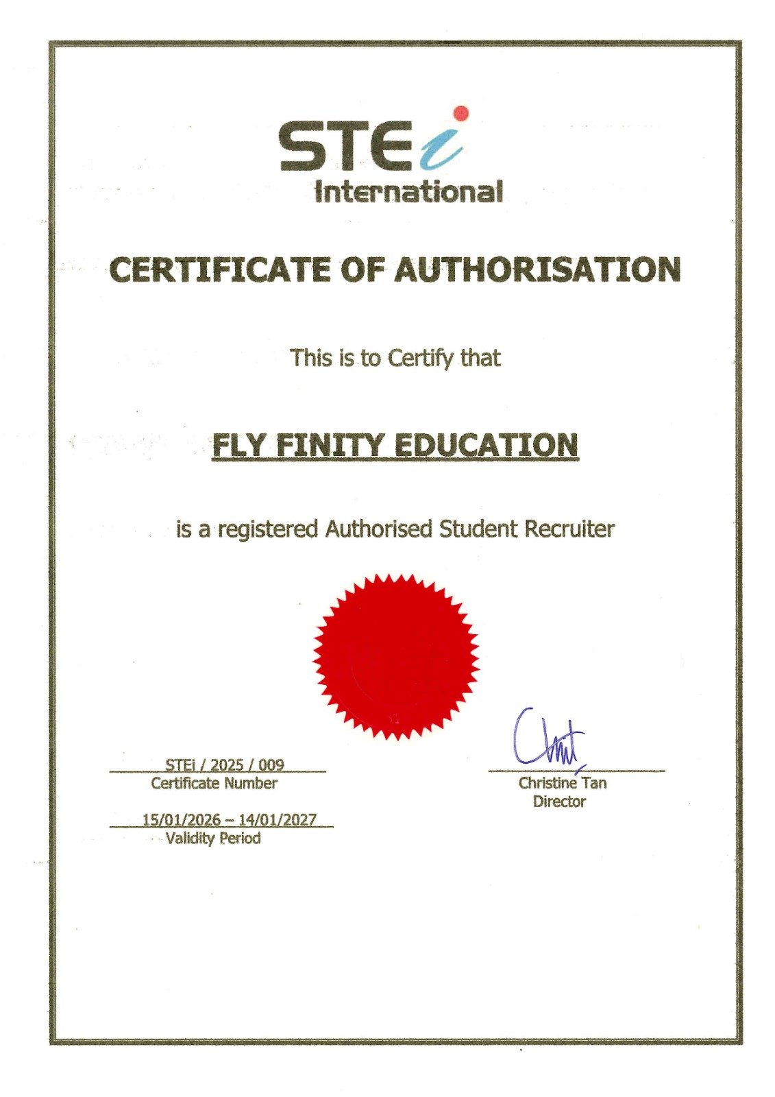 Fly Finity Education is an officially authorised student recruitment partner of STEi International, Singapore, committed to guiding students toward globally recognised education pathways.